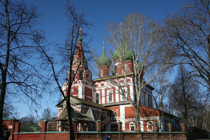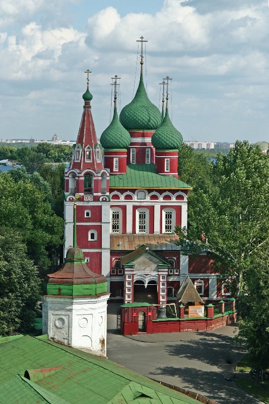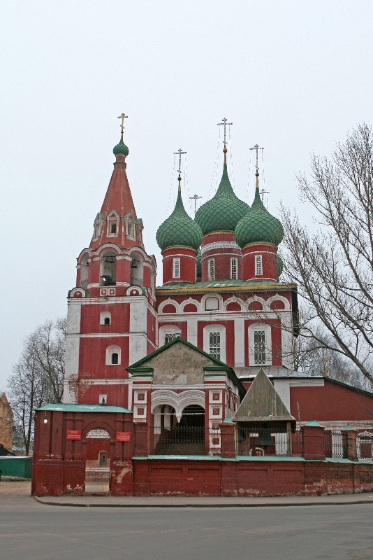 Церковь Михаила Архангела была построена в 1658-1682 годах. По преданию, первый храм на этом месте поставил ярославский князь Константин в 1216 году, и посвятил его покровителю воинов Архангелу Михаилу. Спустя 79 лет ярославская княгиня Анна Ногаевна, из татарского княжеского рода, жена князя Федора Ростиславича, построила на этом месте новую деревянную церковь и передала туда ценные дары, которые сохранялись в храме до 1918 года. Княгиня Анна поставила храм не просто так, а в память о своем деде, императоре Михаиле VIII Палеологе. Строительство нового каменного храма на средства прихожан, посадских людей, длилось долго, и поэтому в его архитектуре отразились черты двух эпох ярославского зодчества. Основа храма, его общая композиция относится к ярославской архитектуре первой половины XVII века: крупный четверик на высоком подклете (подклет использовался для хранения товаров) опоясан галереями, в северо-западном углу которых поставлена шатровая колокольня. Но пока длилось строительство, вкусы в храмовой архитектуре Ярославля переменились: от зодчих стали требовать более выразительного силуэта, более заметного издалека. Кроме того, исчезло красивое, но непрактичное позакомарное покрытие, поэтому верхняя часть храма уже относится к направлению второй половины XVII века. Это пять плотно стоящих высоких глав на мощных световых барабанах, поставленных на четырехскатную кровлю, под которой проведен ряд ложных закомар. Фасады храма получили большие окна с красивыми наличниками, а высокие крыльца украшены изразцами. Храм со временем был перестроен, но не сильно: разобрали северное крыльцо, ведшее на галерею, в самой северной части галереи устроили придел Зосимы и Савватия. Расписан храм был не сразу, а только в 1731 году артелью ярославских мастеров, руководимой известным местным изографом Федором Федоровым. Эти росписи сохранились до наших дней. В советское время храм был закрыт в 1924 году и передан под склад. Находился в ведении Ярославского музея-заповедника, реставрировался. С 1992 года снова передан Церкви, заново отремонтирован и открыт для служб.